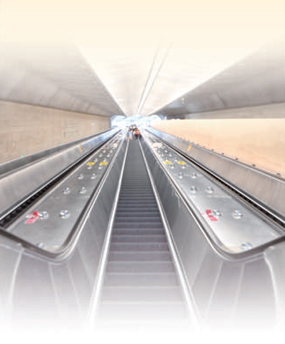 八达岭长城站安装了近百米长的扶梯,垂直高度42米,相当于一幢10多层高的住宅楼。图为八达岭长城站超大扶梯。