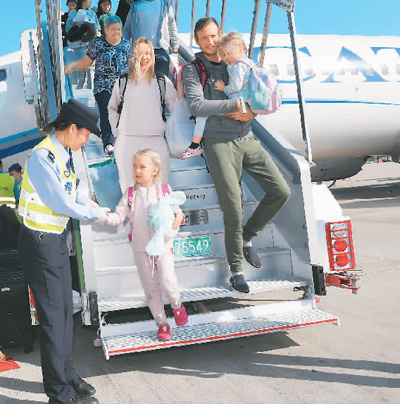 海南省三亚市积极推动境外航线恢复和境外航线网络布局工作,累计开通了15条境外航线,包含往返首尔、雅加达、河内、阿拉木图、曼谷、新加坡、莫斯科等境外航线。图为三亚凤凰国际机场凤凰出入境边防检查站民警引导由阿拉木图飞抵三亚的旅客下机。